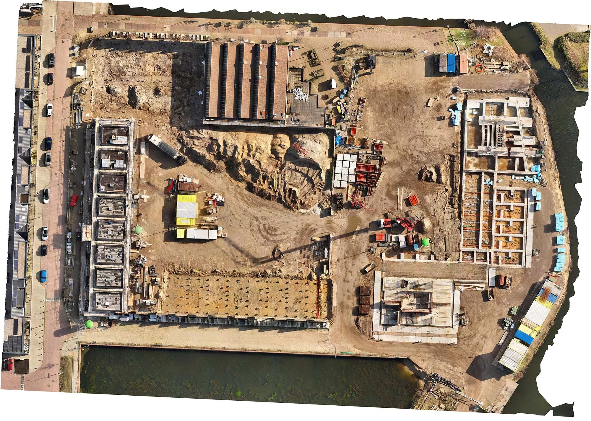 Hier zie je twee orthofoto’s van het bouwterrein. Een orthofoto is een luchtfoto die recht van boven is gemaakt en daardoor lijkt op een plattegrond van het gebied.